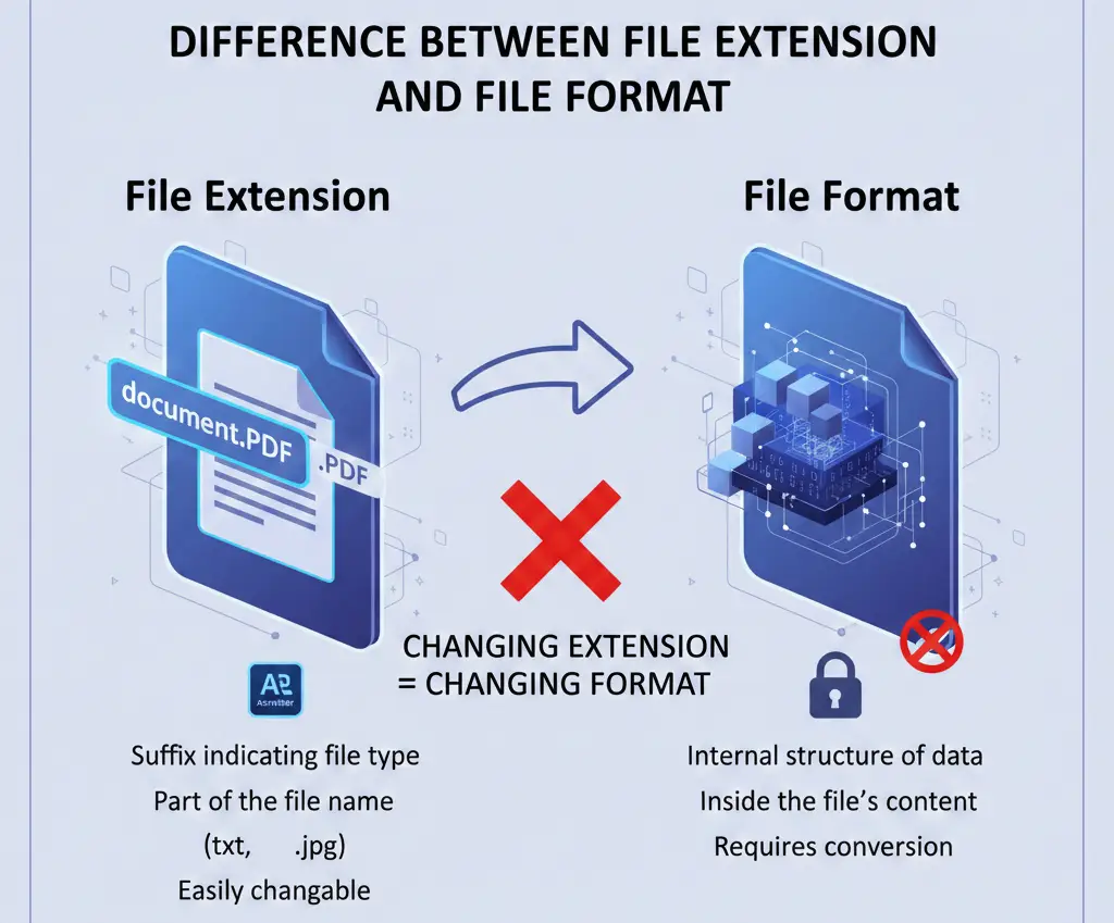 Understand the crucial difference between a file extension and its underlying file format. Learn why changing an extension doesn't change the format.